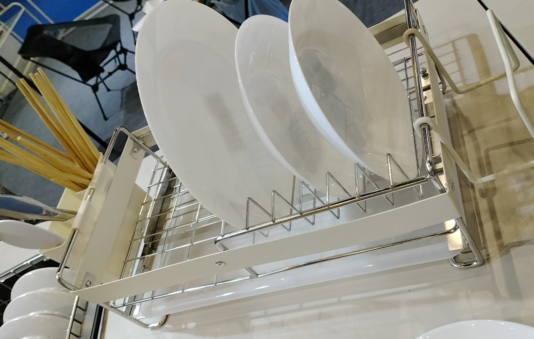 Køkkenopbevaringsserier: Et standout var det udtrækbare opvaskestativ i rustfrit stål, designet til optimal funktionalitet og pladseffektivitet. Serien inkluderer også multifunktionelle vægmonterede stativer og magnetiske knivholdere, alle udformet med minimalistisk æstetik ideel til kompakte moderne køkkener.
